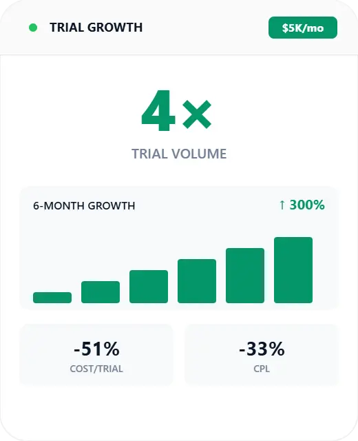 Niche market, zero awareness. Built a growth engine that 4×'d trials on $5K/month.