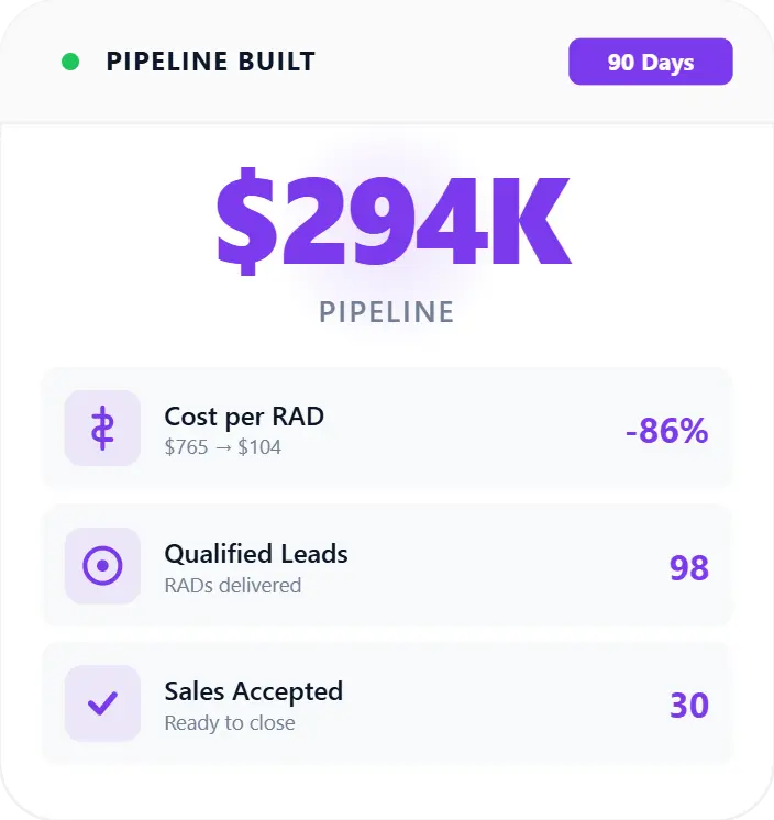 Multi-channel demand engine. $294K pipeline with 86% cost reduction in 90 days.