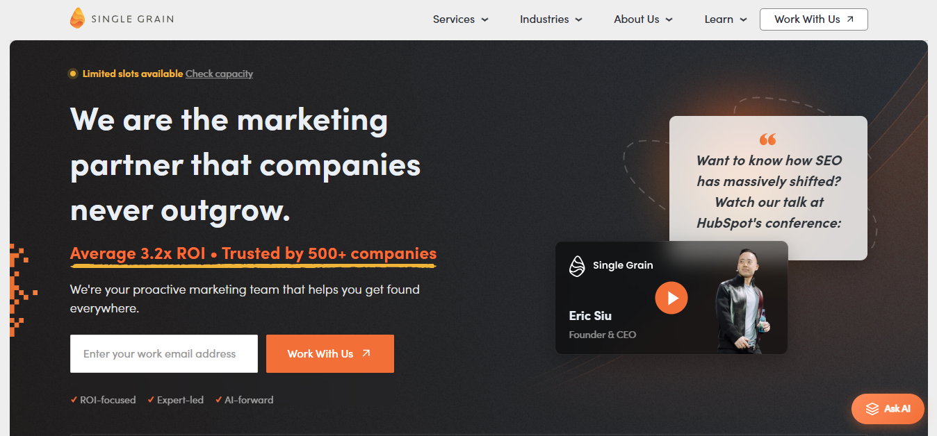 Single Grain is a top-tier US agency known for blending AI-powered SEO, paid acquisition, and conversion optimization for SaaS companies. Their team excels in scaling content-led demand and integrating AI into keyword clustering, search intent mapping, and predictive content strategy.