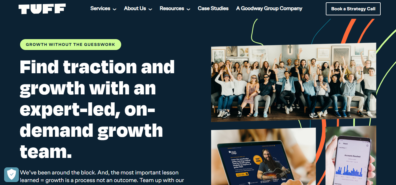 Tuff Growth acts like an embedded growth team — ideal for early-stage SaaS. They rely on rapid experiment cycles combined with AI-powered data insights to learn quickly, refine ICP, and find scalable channels.